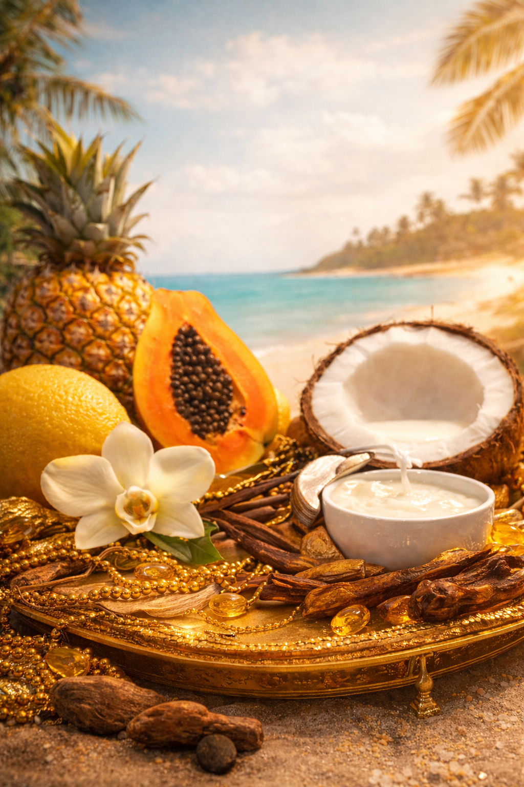 This fragrance opens with the juicy brightness of papaya and pineapple, instantly transporting you to a sun-drenched paradise. As it settles, smooth coconut milk and rich vanilla create a creamy, irresistible heart that feels like warm summer skin and luxury sunscreen on the beach. Finally, Caribbean woods anchor the scent with a soft, exotic warmth that lingers like the memory of an unforgettable vacation.